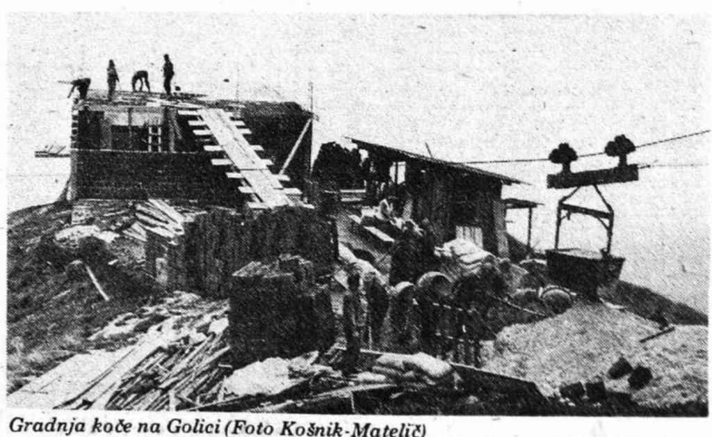 Members of the Jesenice Mountaineering Society know no rest during this summer season. With great enthusiasm and energy, they are engaged in the construction of the new hut on Golica. For many years, numerous mountaineers visiting the Karavanke have expressed the desire to have, in this part of our mountain world, a spot where they could rest, refresh themselves, and even spend the night. The mountaineers of Jesenice have listened to these wishes, and the construction of the new hut is progressing successfully.